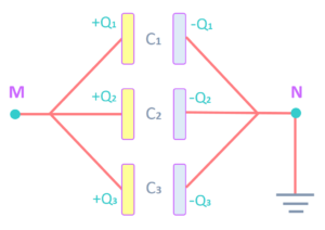 এবার ধরা যাক, C1, C2 3 C3 ধারকত্বের ধারক তিনটিতে জমা থাকা চার্জের পরিমাণ যথাক্রমে Q1, Q2, 3 Q3 এবং M ও N পাত দুটোর মধ্যে বিভব পার্থক্য = V.