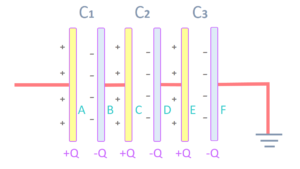 প্রথম ধারকের প্রথম পাত -তে পরিমাণ ধন চার্জ প্রদান করলে তড়িৎ আবেশের দরুন এর দ্বিতীয় পাত -তে পরিমাণ ঋণ চার্জ এবং দ্বিতীয় ধারকের প্রথম পাত C-তে Q পরিমাণ ধন চার্জ আবিষ্ট হবে। দ্বিতীয় ধারকের প্রথম পাতের ধন চার্জের দরুন তার দ্বিতীয় পাতে পরিমাণ ঋণ চার্জ এবং তৃতীয় ধারকের প্রথম পাতে � পরিমাণ ধন চার্জ আবিষ্ট হবে।